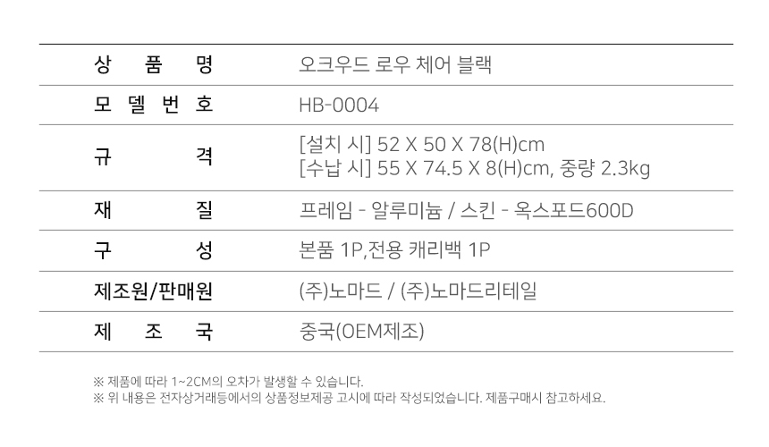 노마드 BBQ 의자 휴버프 오크우드 로우 체어 블랙 접이식 캠핑 용품 HB-0004