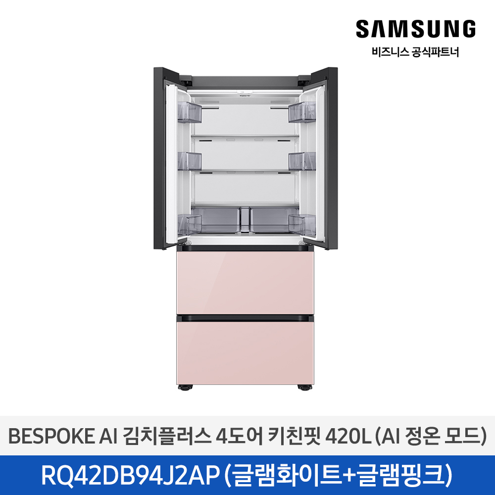 삼성 BESPOKE AI 김치플러스 김치냉장고 4도어 키친핏 420L AI정온모드 글램화이트+핑크 / RQ42DB94J2AP52