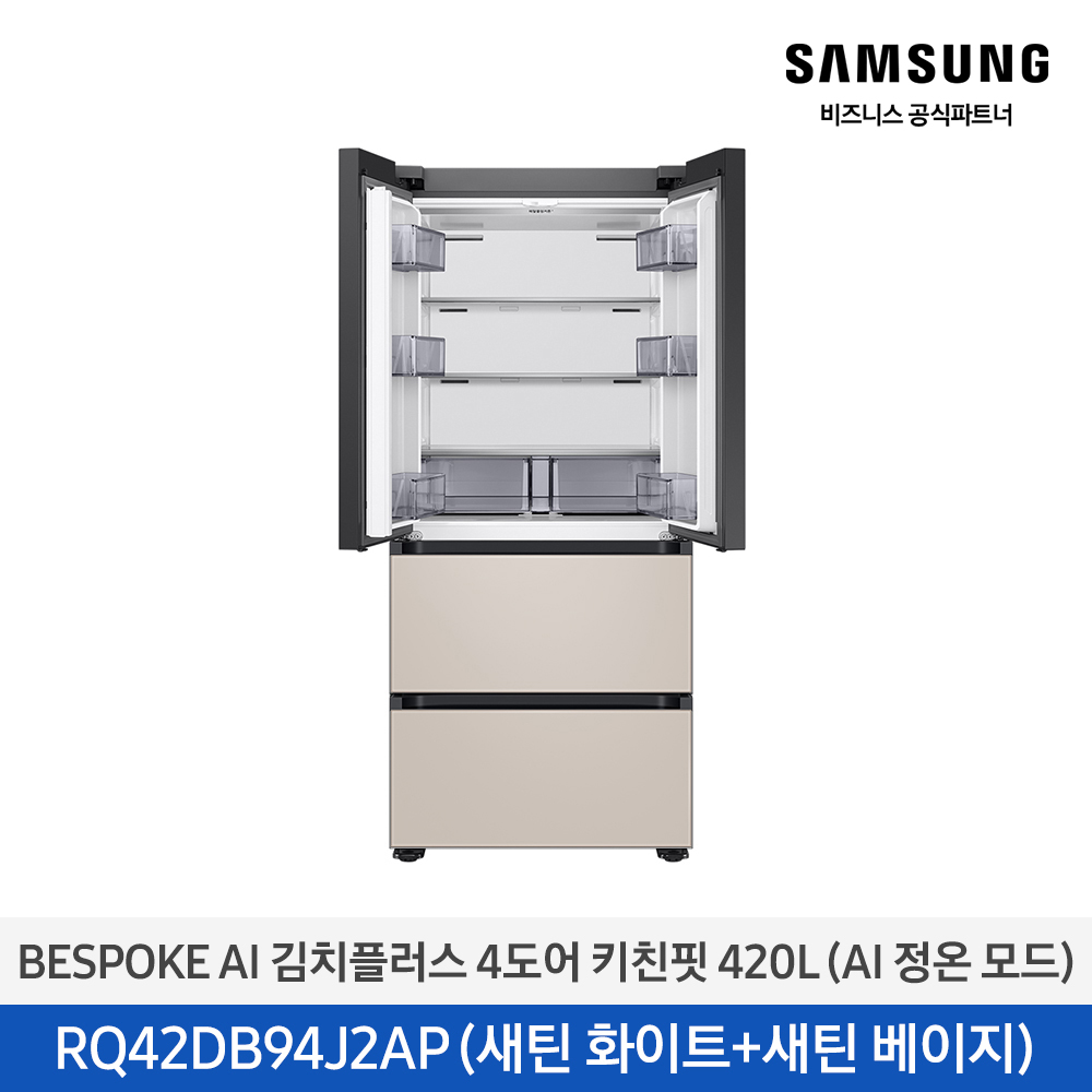 삼성 BESPOKE AI 김치플러스 김치냉장고 4도어 키친핏 420L AI정온모드 새틴화이트+베이지 / RQ42DB94J2APWB